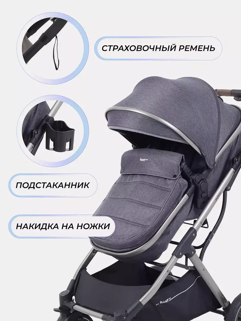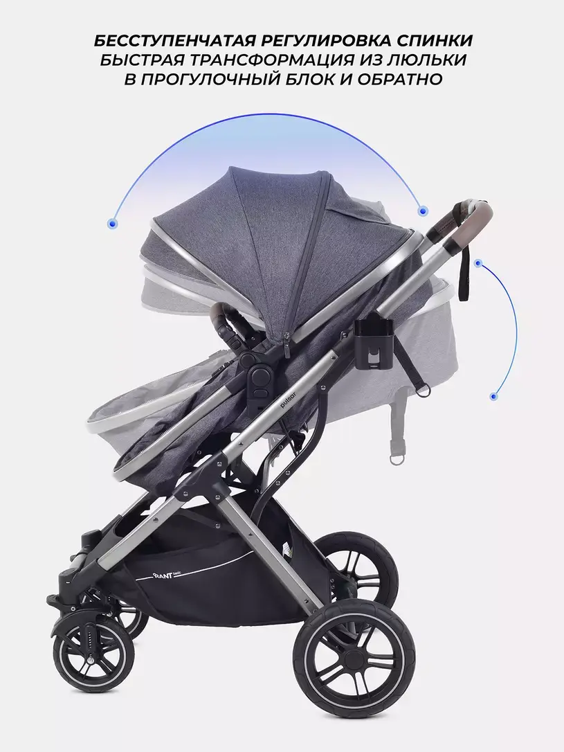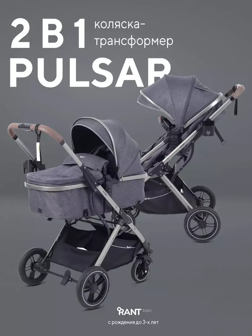 Коляска-трансформер Rant Basic Pulsar Необходимый комфорт! Плюсы люльки и прогулочного блока: - люлька в два движения трансформируется в прогулочный блок - блок переставляется лицом к маме/лицом к миру - спинка плавно регулируется до горизонтального положения - дополнительная секция, увеличивающая капюшон -смотровое/вентиляционное окно в капюшоне на магните для спокойствия родителей Вас приятно удивят: - подстаканник для любимых напитков - страховочный ремень на руку - чехлы выполнены из плотной ткани, защищенной от грязи, влаги, выгорания специальной пропиткой - бампер откидной, что всегда удобно для быстрого доступа к ребенку - тормоз-“качелька” не испачкает обувь - просторная корзина вместит все необходимое - передние плавающие колеса фиксируются для прохода по сложным участкам - пружинная амортизация максимально поглощает вибрацию - бескамерные колеса, выполненные из резины, обеспечивают мягкий ход и не требуют ухода - максимальный диаметр задних колес делает модель по-настоящему вездеходной - удобный кармашек для нужных мелочей - компактность в сложенном виде